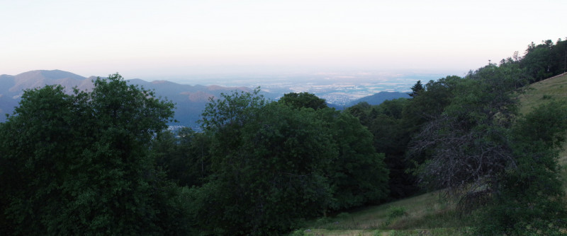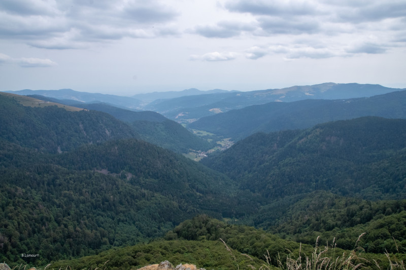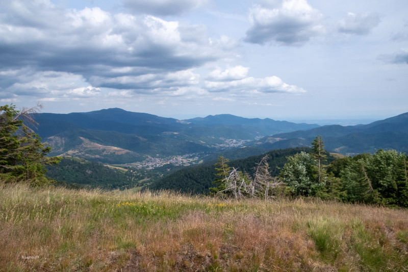 Le panorama que nous pouvons observer à partir de la terrasse de la ferme-auberge est fantastique : face à nous, nous avons le Grand Ballon et donc nos deux dernières étapes. Dans le creux de la vallée, la Thur, rivière qui passe à Thann et que nous allons surplomber tous les jours. Au loin vers le sud-est, la plaine d’Alsace un peu embrumée barrée par le massif de la Forêt Noire. Au Sud, les faubourgs de Mulhouse... Nous nous couchons en en ayant pris plein les yeux !
