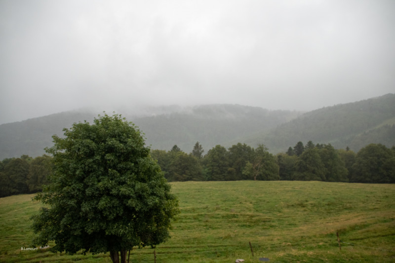Là encore le chemin hésite constamment entre la descente et la montée ! Nous pique-niquons au col de Pourri Faing, le long d’une belle tourbière, bel espace protégé. Nous descendons ensuite au col de Bramont (956m) juste avant d’attaquer la grande montée vers le sommet du Rainkopf (1305m). Il reste encore trois bons kilomètres à parcourir jusqu’à l’auberge du Schmargult, située idéalement en haut des pistes de skis de La Bresse.