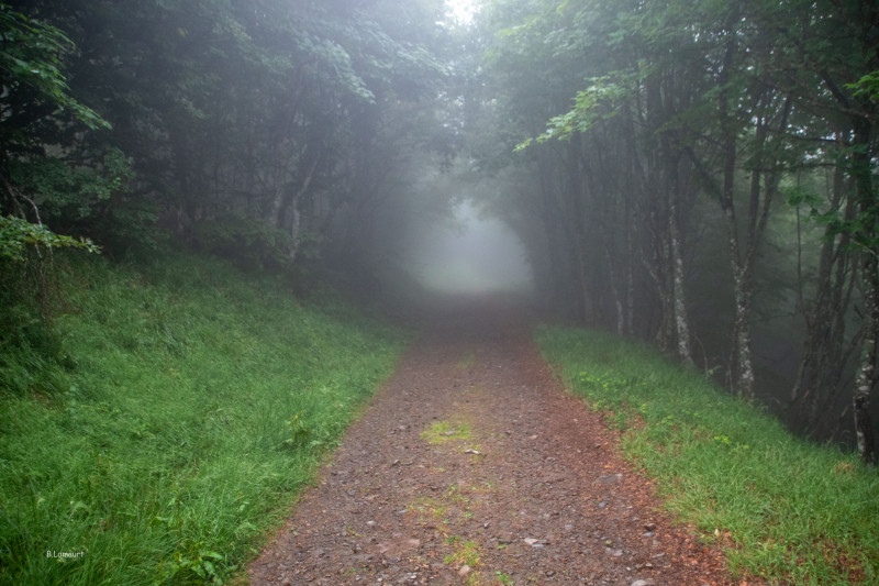C’est donc revêtus des capes que nous démarrons l’étape. Le temps commence par se lever un peu. Nous passons le Markstein au-dessus des nuages. A partir de là, le chemin suit et domine la route des crêtes : nous sommes dans les bois et les nuages. Celui qui traîne à l’arrière du groupe perd vite de vue les autres participants.