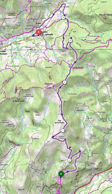 Mardi 25 juin : Aujourd’hui, nous changeons de vallée : Thiézac est dans la vallée de la Cère et Mandailles, notre étape du jour est dans la vallée de la Jordanne. Il va donc falloir grimper jusqu’au Puy de la Poche, rejoindre la crête de l’Elancèze avant de redescendre vers le col du Pertus où le Tour de France passera dans quelques jours !