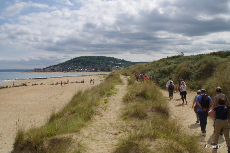 Vendredi 31 mai, réveil avec le soleil... encore un peu frais le matin, mais ça ne va pas durer! Départ vers 8h45 en direction de Dives qui sera notre point de départ pour aller visiter Cabourg. Une belle zone pavillonnaire nous sert d'approche (certains envient les pelouses normandes!) et nous arrivons dans la rue principale (le boulevard de la mer) déjà bien animé: les vitrines retardent certains marcheurs! Nous contournons le Grand Hôtel pour arriver sur le bord de mer. Les sanitaires sont particulièrement recherchés et nous découvrons que nous sommes sur le méridien de l'Amour. Nous prolongeons le bord de mer jusqu'à une zone dunaire, puis rejoignons nos voitures. Direction, la Redoute de Merville avec ses blokhaus où nous pique-niquons avant de démarrer la randonnée qui va nous entraîner d'abord autour de la réserve ornithologique de Gros Banc (avec la chaleur, les oiseaux dorment!) puis parmi le boccage normand à Gonneville où nous ferons une pause dans la parc de la mairie. Nous passons ensuite à la batterie de Merville, en plein préparatif pour les cérémonies des 75 ans du débarquement. Enfin, nous rejoignons Merville-Franceville et enfin nos voitures. Au total, dans la journée, nous avons fait une vingtaine de kilomètres!