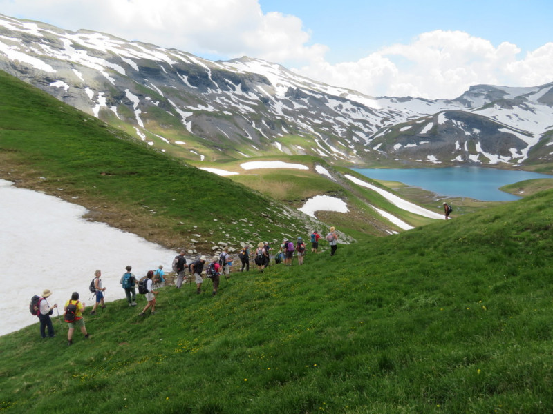 Contrairement aux préconisations de la fameuse fiche rando, nous décidons de faire la randonnée à l’envers : le dénivelé reste le même, mais la pente semble moins dure dans ce sens. Nous laissons comme nous pouvons les voitures au parking du Fardelay, puis nous prenons la direction du cirque des Fonts : au bout de ce cirque, un petit hameau, Les Fonts, que nous atteignons au bout d’une heure et demi : nous ne nous sommes élevés que de 150m, il reste encore une grande montée de 850m, mais par chance elle est à l’ombre ! Nous grimpons dans un jardin alpin rempli de fleurs de toutes les couleurs. Nous arrivons vers midi au petit col d’Anterne, non sans avoir traversé un petit restant de neige ! Nous sommes à 2076m quand même et nous en profitons pour pique-niquer. Il reste encore une centaine de mètres à monter parfois dans la neige pour atteindre le lac d’Anterne, bien caché dans son trou !