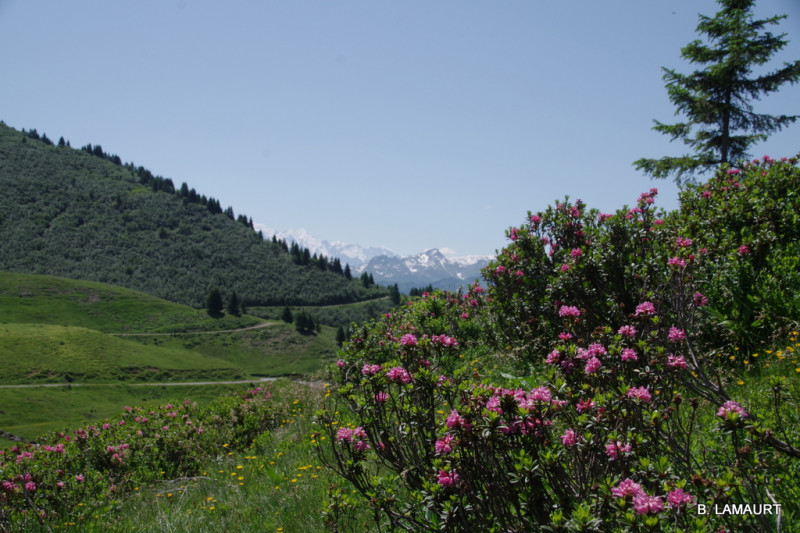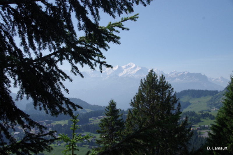 Quelques courbatures le matin en redémarrant... Aujourd'hui, nous prenons la voiture en direction des Gets. La randonnée va nous emmener de prairies fleuries en forêts au col de Joux Plane où nous pique-niquerons avec vue sur le Mont-Blanc: il y a plus désagréable comme salle à manger!